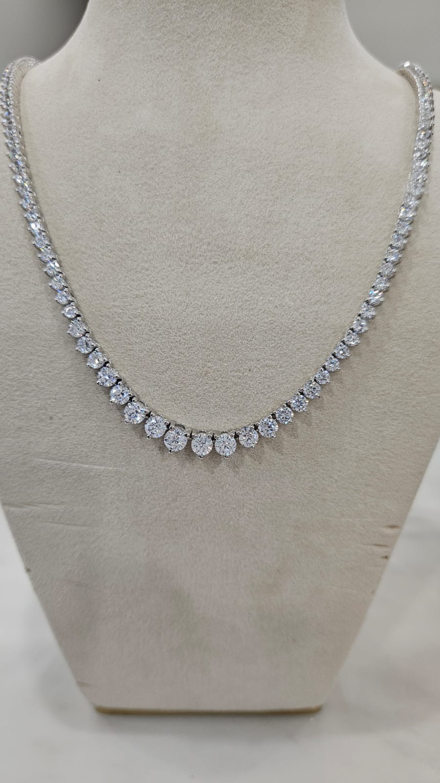 A gorgeous Graduated Tennis necklace. A necklace every woman would like to have in her collection. Ten carats total weight of Natural diamonds. F colour SI1, beautiful white diamonds to have around your neck. Each diamond carefully selected. This is the extra care we give in every piece which is made. Made for you by our professional craftsman jewellers. Available in yellow and white gold. Ask our professional sales advisors for any assistance.