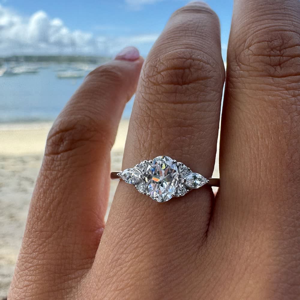 This engagement ring enchants with the graceful silhouette of an oval diamond, set within a design inspired by the bold geometry and refined artistry of the Art Deco era. The elongated shape of the centre stone brings an elegant, sophisticated allure, while its brilliant facets catch and reflect light with dazzling radiance, capturing attention from every angle. All Temple and Grace jewellery is beautifully crafted to the highest standards and is made at our jewellery workshop directly by us (skilled jewellery craftsmen). This is why you can save over 40% when compared to high-street retail prices. We also offer a lifetime warranty and unmatched 100 day returns. You can shop online or book an appointment to visit our jewellery boutiques in Sydney, Melbourne, Brisbane, Perth and Adelaide.