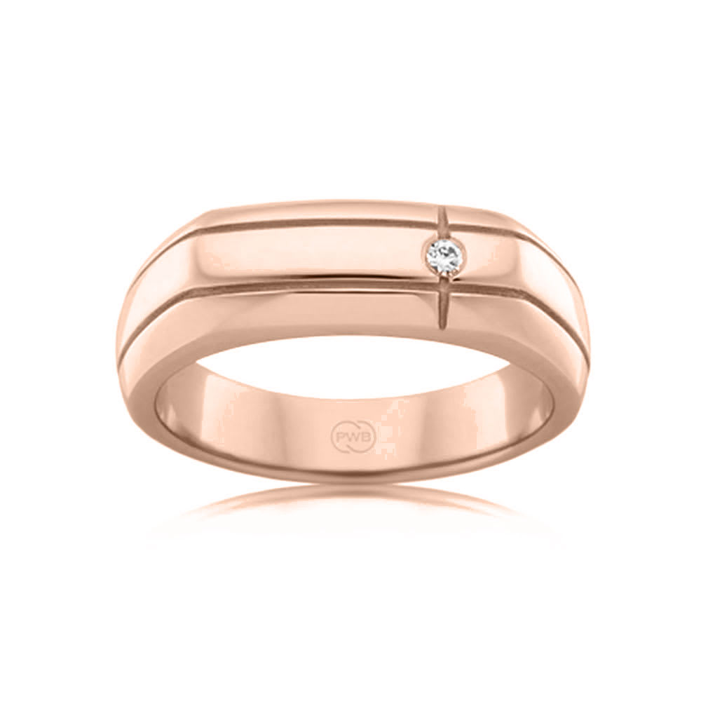 This sleek and stylish men's signet wedding band in 18K gold is embellished with a sparkling round diamond. The bezel-set diamond sparkles endlessly and captivates with its sheer elegance. This ring is available in 18K white, yellow, rose gold, platinum 600, and platinum 950. The jewellery is beautifully handmade to the highest standards. Shop directly from us and save over 40% when compared to high-street retail prices. We also offer unmatched 100 day returns. Buy online or book an appointment to visit our jewellery boutiques in Sydney and Melbourne.