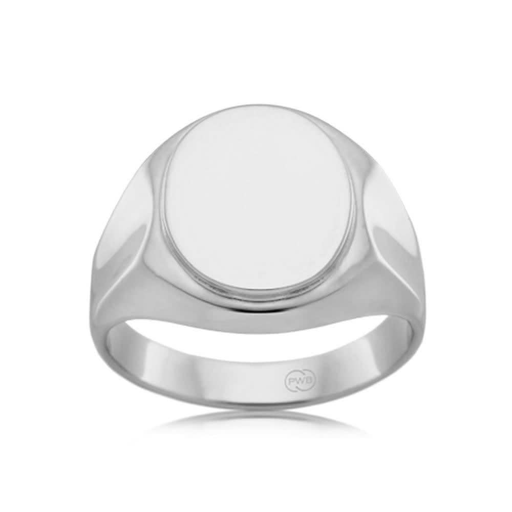 Symbolizing remarkable style, this men's oval signet wedding band is crafted in 18K white gold with a comfort fit interior and hand-carved shank. It has a lustrous satin finish for a striking look. This ring is available in 18K white, yellow, rose gold, platinum 600, and platinum 950. The jewellery is beautifully handmade to the highest standards. Shop directly from us and save over 40% when compared to high-street retail prices. We also offer unmatched 100 day returns. Buy online or book an appointment to visit our jewellery boutiques in Sydney and Melbourne.