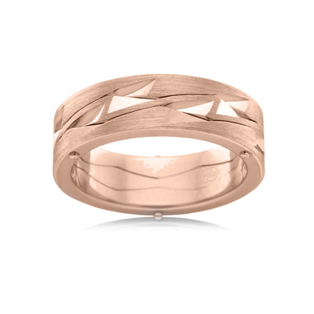 This modern textured wedding ring features a brushed finished central section with alternating coarse hand-carved patterns in an 18K gold center. The unique look flawlessly exhibits traditional craftsmanship. The interior of the ring has a polished finish. This ring is available in 18K white, yellow, rose gold, platinum 600, and platinum 950. The jewellery is beautifully handmade to the highest standards. Shop directly from us and save over 40% when compared to high-street retail prices. We also offer unmatched 100 day returns. Buy online or book an appointment to visit our jewellery boutiques in Sydney and Melbourne.