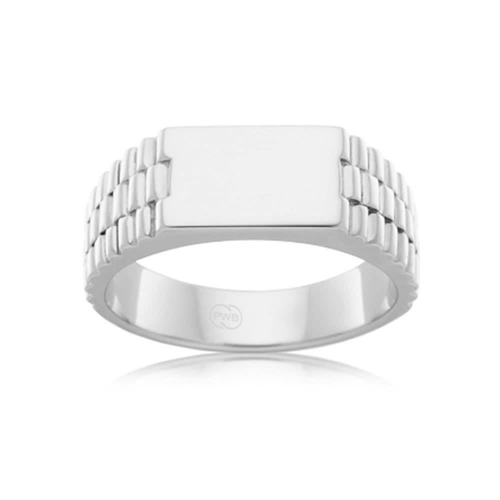Featuring a stunning rectangle signet at the center and adorned with a triple row curved pattern on the sides, this exquisite 7mm men's wedding band is designed in 18K gold. It has a glossy look and comes with a comfortable snug fit. This ring is available in 18K white, yellow, rose gold, and platinum 950. The jewellery is beautifully handmade to the highest standards. Shop directly from us and save over 40% when compared to high-street retail prices. We also offer unmatched 100 day returns. Buy online or book an appointment to visit our jewellery boutiques in Sydney and Melbourne.