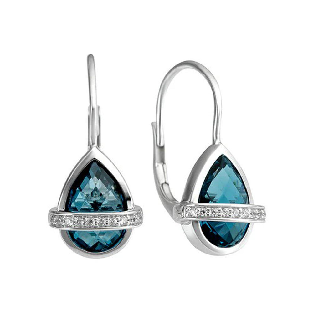 Stunning and elegant London blue topaz set with a half sphere of diamonds. These earrings would look gorgeous on an evening out or with smart dress during the day. Made in 18ct with lever backs for extra security when wearing. The London blue topaz is set in a bezel setting with the half sphere going across. Made professionally by our jewellers who exceed detailed craftsmanship. Made in yellow, white or rose gold. Ask our professional sales advisors for any assistance.