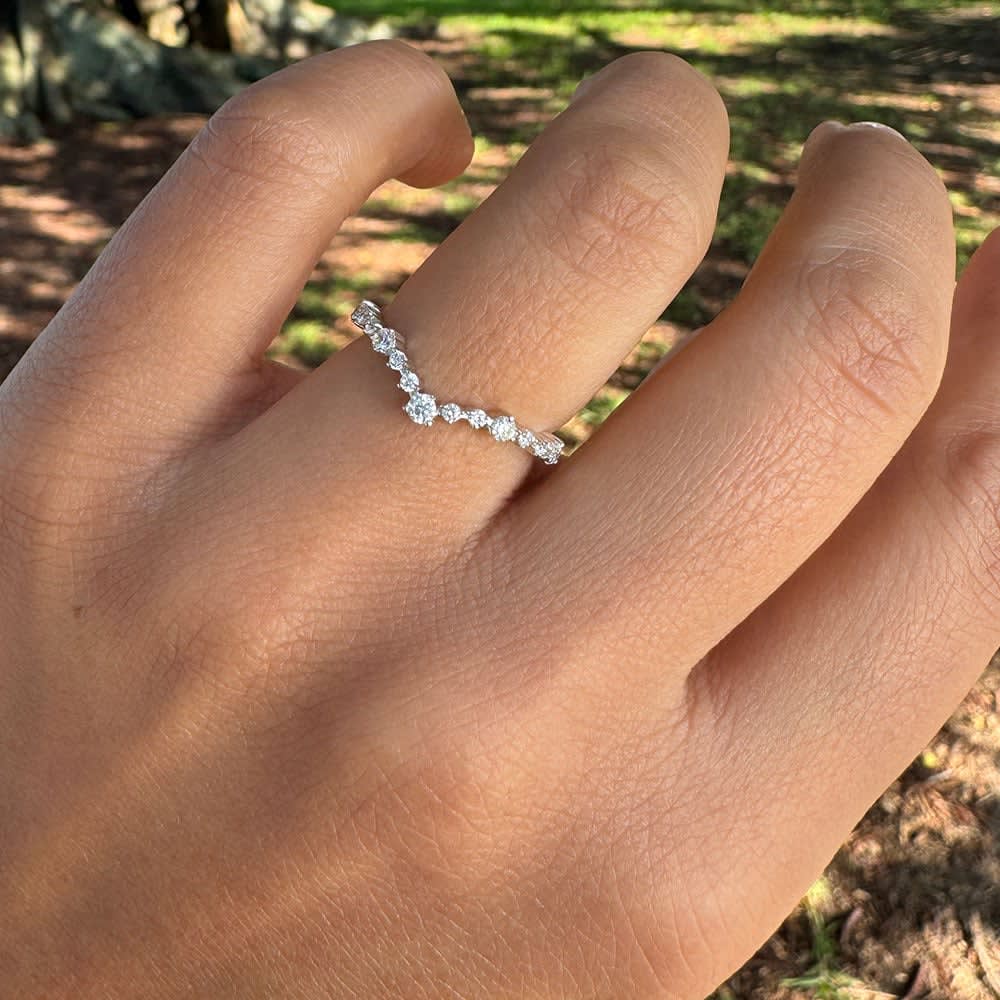 A beautiful slight curved tiara wedding band. A elegant band to sit beside your engagement ring. Diamonds enhance the design more and would look lovely as a wedding ring alone. Available in yellow, rose and white gold. Ask our professional sales advisors for any assistance.