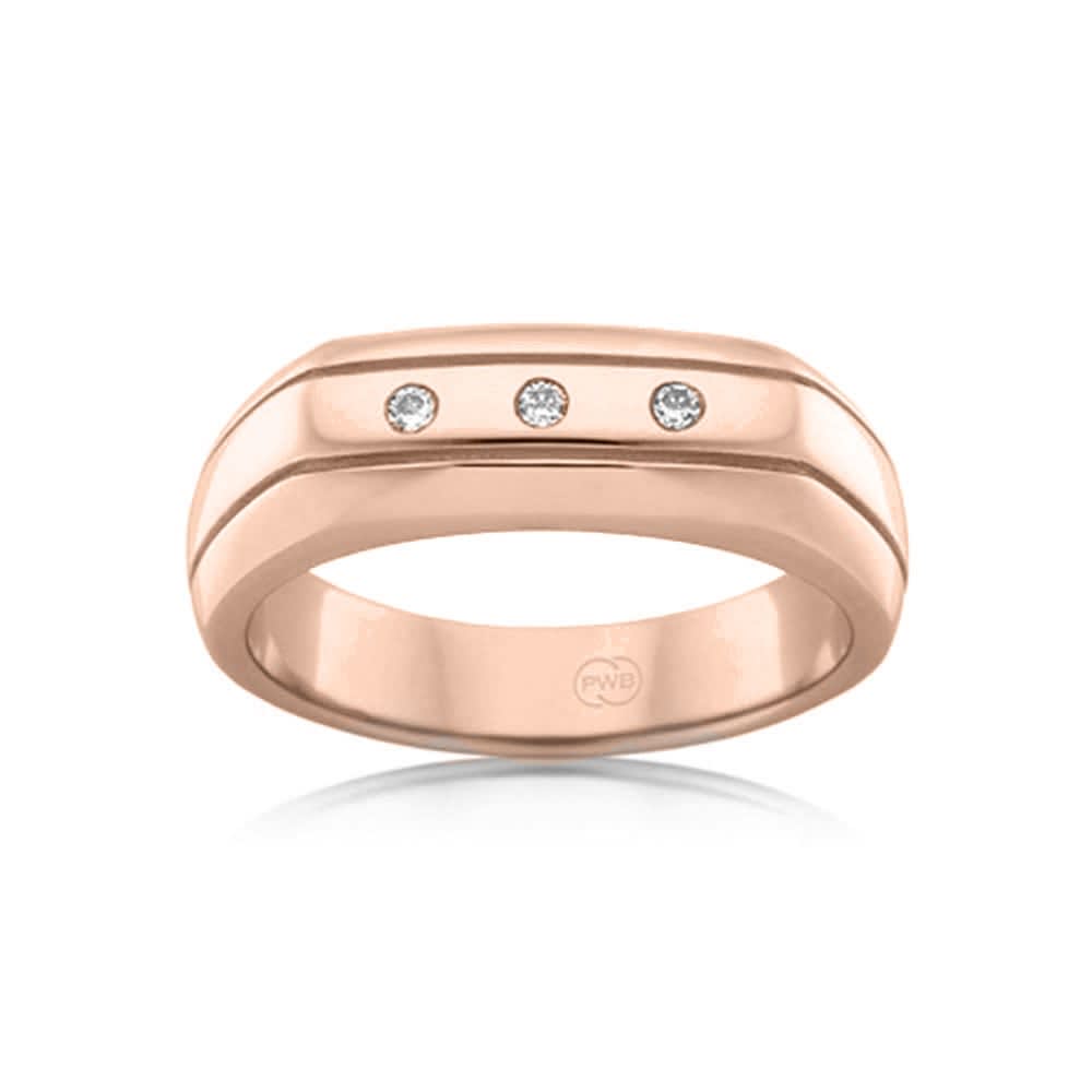 Featuring a smooth and satiny surface, this comfort fit men's wedding band is designed in 18K yellow gold. The central double groove and the three round cut diamonds carry a polished finish and look fetching on the wedding band. This ring is available in 18K white, yellow, rose gold, platinum 600, and platinum 950. The jewellery is beautifully handmade to the highest standards. Shop directly from us and save over 40% when compared to high-street retail prices. We also offer unmatched 100 day returns. Buy online or book an appointment to visit our jewellery boutiques in Sydney and Melbourne.