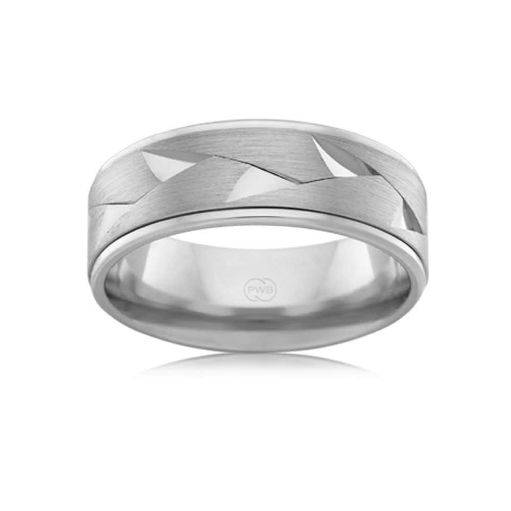 This modern textured wedding ring features striking polished edges and alternating polished and coarse hand-carved patterns in an 18K gold center. The unique look flawlessly exhibits traditional craftsmanship. This ring is available in 18K white, yellow, rose gold, platinum 600, and platinum 950. The jewellery is beautifully handmade to the highest standards. Shop directly from us and save over 40% when compared to high-street retail prices. We also offer unmatched 100 day returns. Buy online or book an appointment to visit our jewellery boutiques in Sydney and Melbourne.