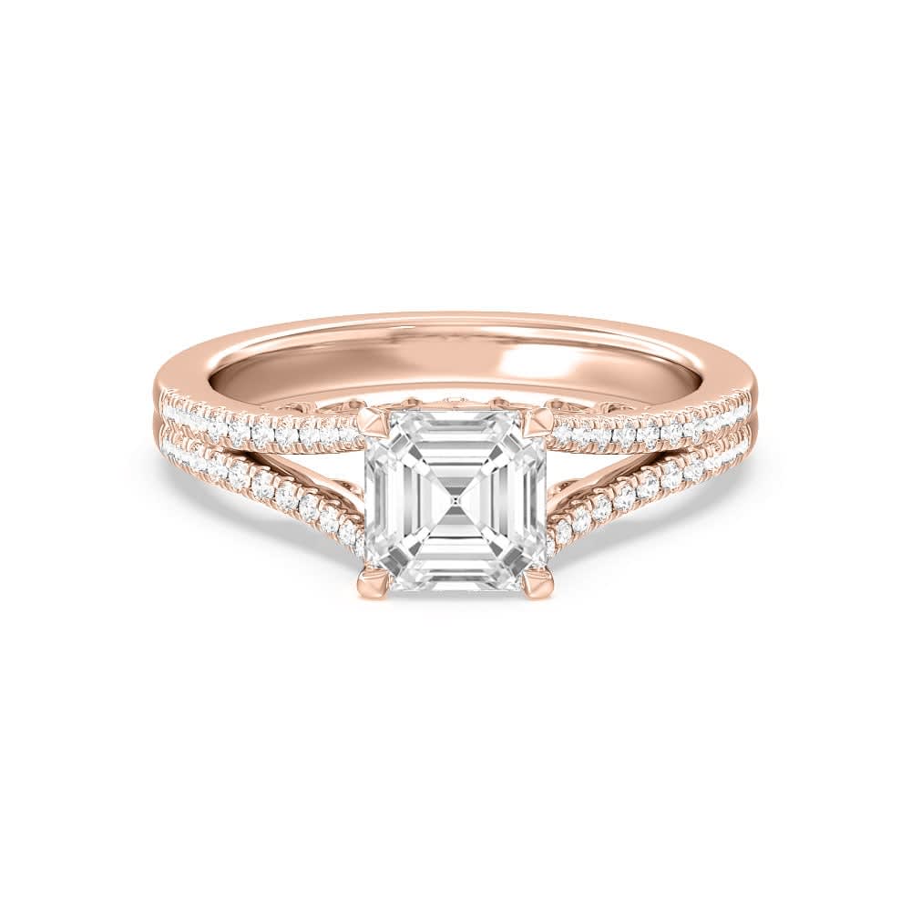 This women's engagement ring features a lab grown asscher diamond as it's focal point, which is set in a strong and secure four prong setting. It's split shanks are in pave setting with glittering diamonds. The diamonds are carefully set in the band and continue up to the stone, creating a seamless and cohesive design. It's scroll gallery has an intricate and subtle detail that adds to the overall beauty of it. A hidden diamond is set within the scroll gallery, which adds a touch of surprise and delight to the ring's design. All Temple and Grace jewellery is beautifully crafted to the highest standards and is made at our jewellery workshop directly by us (skilled jewellery craftsmen). This is why you can save over 40% when compared to high-street retail prices. We also offer a lifetime warranty and unmatched 100 day returns. You can shop online or book an appointment to visit our jewellery boutiques in Sydney, Melbourne, Brisbane and Perth.