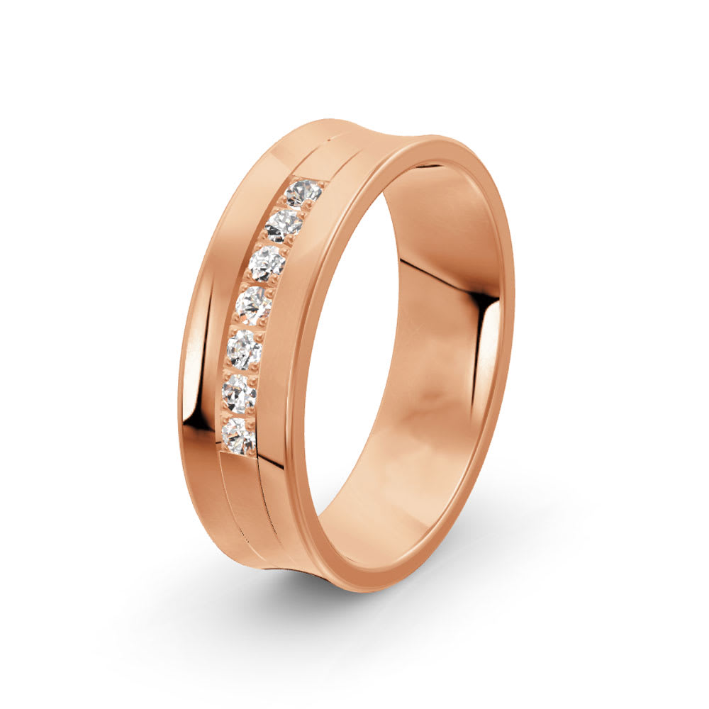 A contemporary band showcasing a row of brilliant round cut diamonds in a refined channel setting. The smooth curves and polished finish add to its sophisticated appeal. All Temple and Grace jewellery is beautifully crafted to the highest standards and is made at our jewellery workshop directly by us (jewellery craftsmen). This is why you can save over 40% when compared to high-street retail prices. We also offer a lifetime warranty and unmatched 100 day returns. You can shop online or visit our jewellery stores in Sydney, Melbourne, Brisbane, Perth and Adelaide or book an appointment to visit our jewellery boutiques.