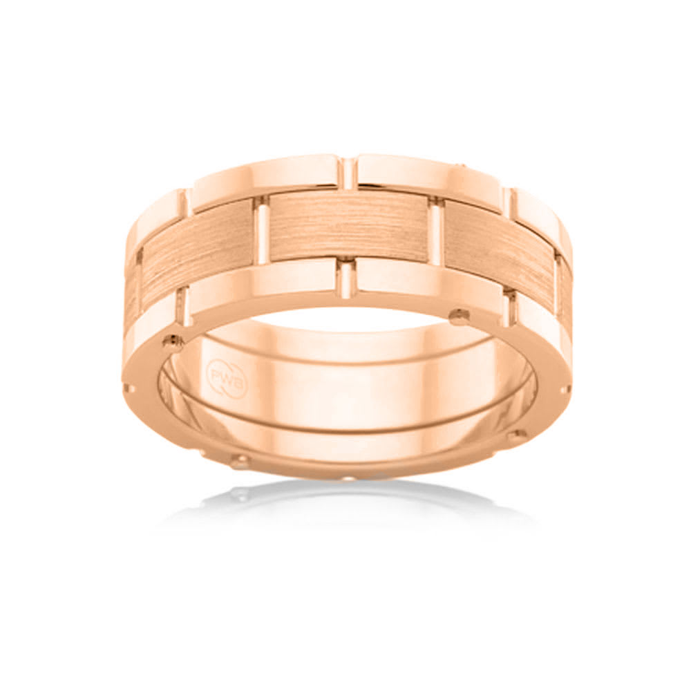 Vertical stripes detail the strong sides of this wedding band. It has a versatile, yet durable, finish. This modern textured wedding ring features a brushed finished central section in an 18K gold center. This ring is available in 18K white, yellow, rose gold, platinum 600, and platinum 950. The jewellery is beautifully handmade to the highest standards. Shop directly from us and save over 40% when compared to high-street retail prices. We also offer unmatched 100 day returns. Buy online or book an appointment to visit our jewellery boutiques in Sydney and Melbourne.