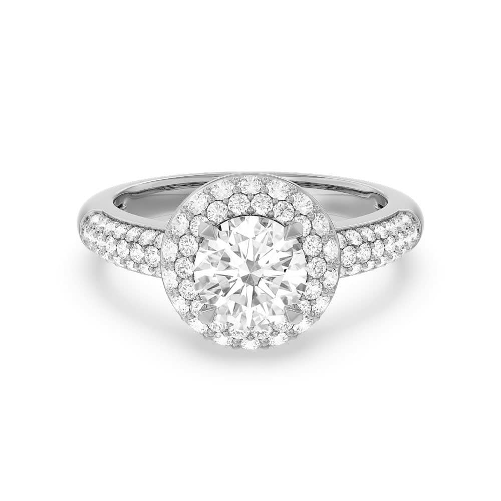 This women's engagement ring features a round brilliant natural diamond as it's focal point. Stones are set in a double halo design, creating a falling effect that adds depth and dimension to the overall look. It's shanks are beautifully accented in a half way pattern, which adds a touch of elegance and sophistication to the design. This ring is a perfect symbol of love and commitment. All Temple and Grace jewellery is beautifully crafted to the highest standards and is made at our jewellery workshop directly by us (skilled jewellery craftsmen). This is why you can save over 40% when compared to high-street retail prices. We also offer a lifetime warranty and unmatched 100 day returns. You can shop online or book an appointment to visit our jewellery boutiques in Sydney, Melbourne, Brisbane, Perth and Adelaide.