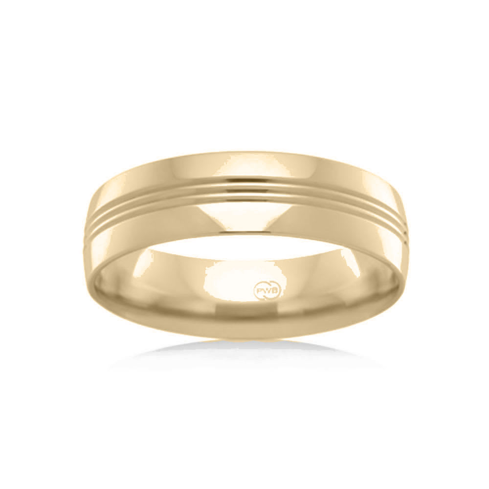 This wedding ring features a stunning design with three grooved lines in the centre, adding an elegant touch to it. The combination of the grooved lines and the polished surface creates a unique and eye catching appearance that is perfect for any wedding or special occasion. All Temple and Grace jewellery is beautifully crafted to the highest standards and is made at our jewellery workshop directly by us (skilled jewellery craftsmen). This is why you can save over 40% when compared to high-street retail prices. We also offer a lifetime warranty and unmatched 100 day returns. You can shop online or book an appointment to visit our jewellery boutiques in Sydney, Melbourne, Brisbane, Perth and Adelaide.