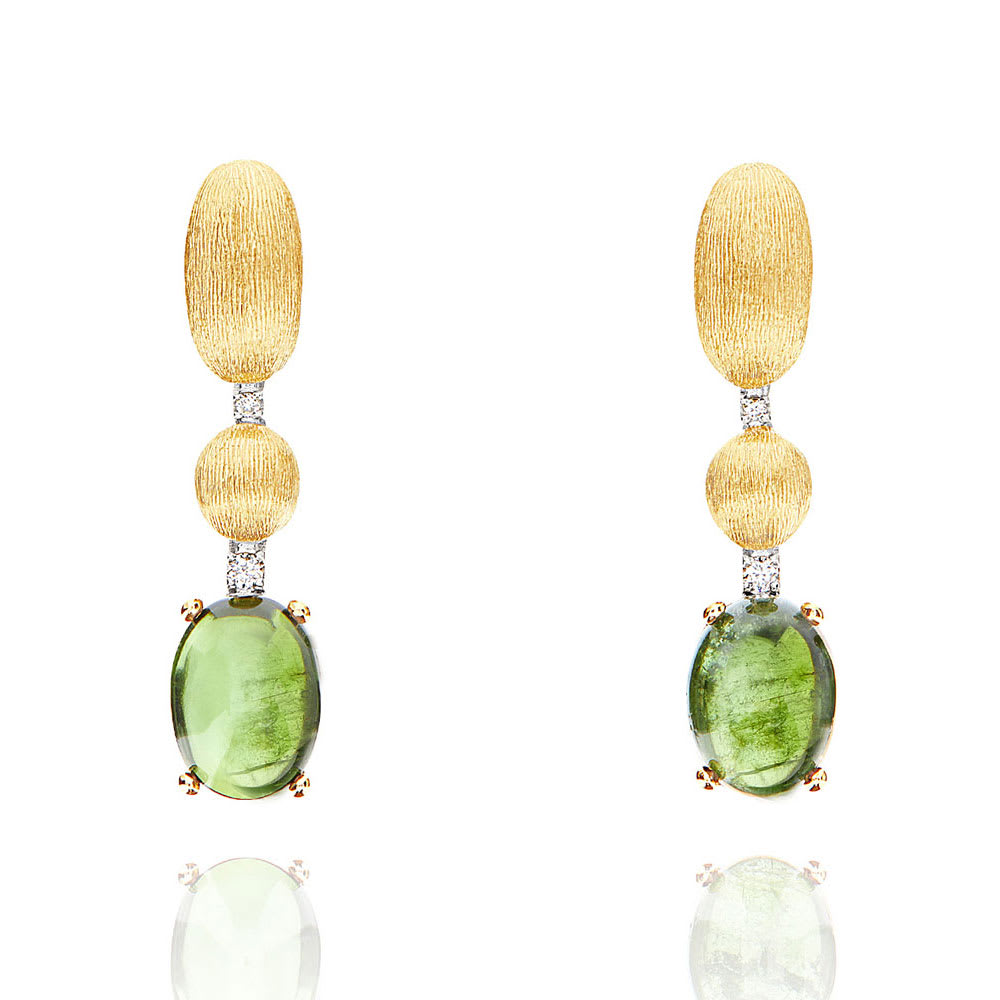 A stunning pair of earrings featuring two boules of hand-engraved 18K gold and a bright green tourmaline boule connected with sparkling diamonds. The unique internal streaks of Tourmaline and gold with 0.03 carat natural diamonds, add elegance and style to these earrings. It is available in 18K white, yellow, rose gold, platinum 600, and platinum 950. The jewellery is beautifully handmade to the highest standards. Shop directly from us and save over 40% compared to high-street retail prices. We also offer unmatched 100 day returns. Buy online or book an appointment to visit our jewellery boutiques in Sydney and Melbourne.