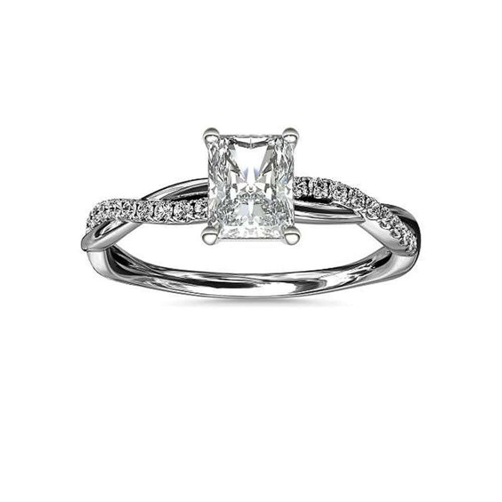 Classic yet modern, this sparkling diamond crossover engagement ring is an ethereal beauty. Crafted in 14K gold, it features a certified radiant cut 0.90carat diamond held in a four-claw setting and is set on a beautifully twisted shank partially embellished with pave set diamonds. A diamond-studded row crosses over a plain band in an infinity pattern that personifies sophisticated regality. This band is available in 18K white, yellow, rose gold, and platinum 950. The jewellery is beautifully handmade to the highest standards. Shop directly from us and save over 40% when compared to high-street retail prices. We also offer unmatched 100 day returns. Buy online or book an appointment to visit our jewellery boutiques in Sydney and Melbourne.